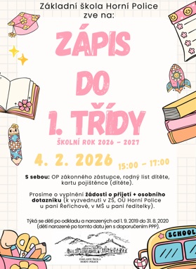 Zápis žáků do 1. ročníku pro školní rok 2026/2027 se koná 4. února 2026 od 15:00 do 17:00.